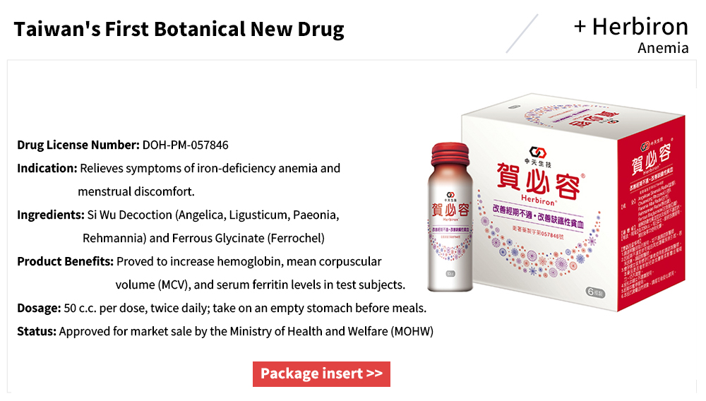 - Herbiron’s clinical efficacy was confirmed in Phase III trials to significantly improve symptoms of iron deficiency anemia in women before menopause and relieved Dysmenorrhea.